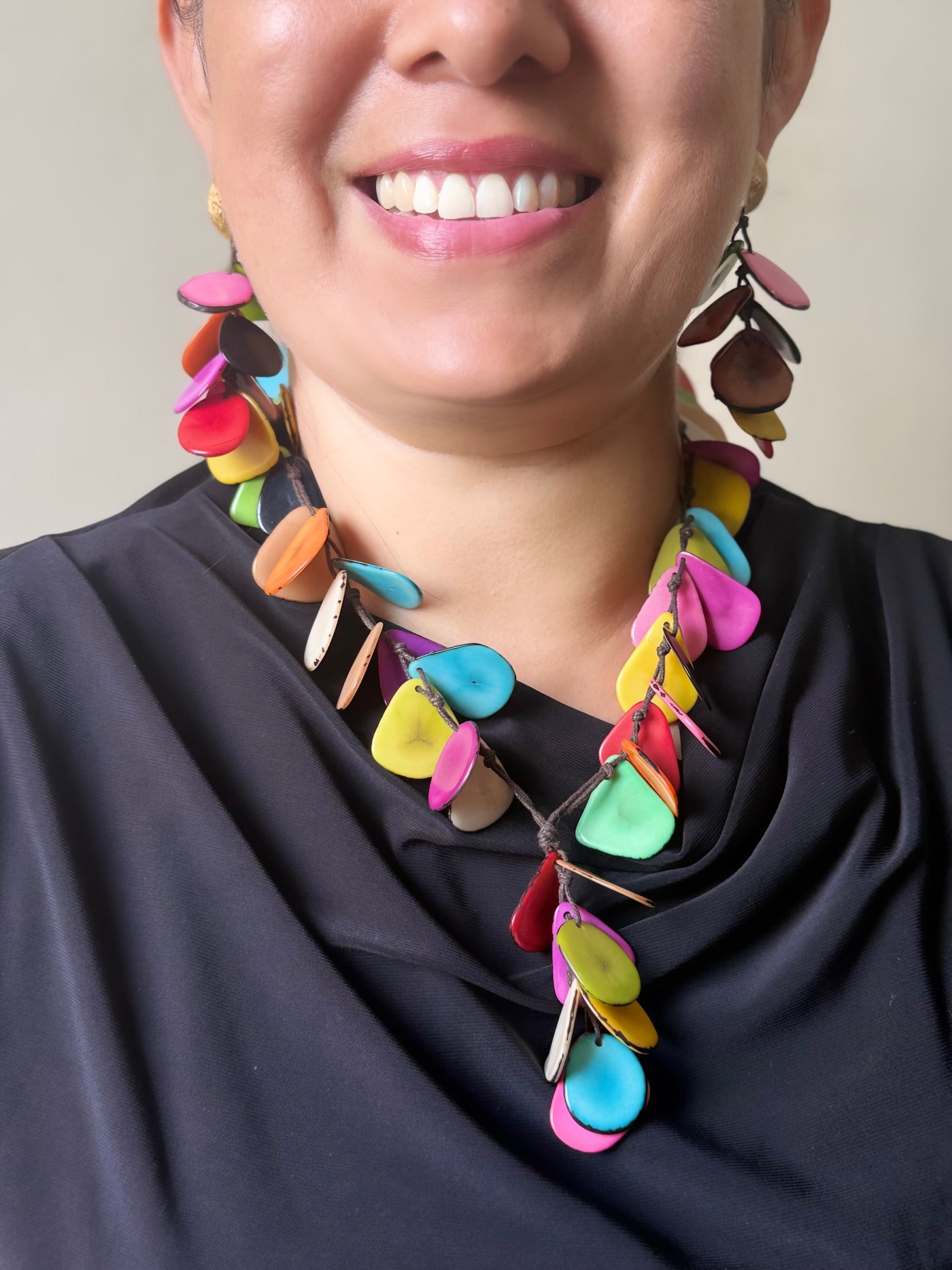 El Collar Color Sacha es una celebración de la naturaleza y los tonos vibrantes del Ecuador. Elaborado con piezas de tagua teñidas una a una, su diseño alegre y auténtico transforma cualquier look en un estallido de color.