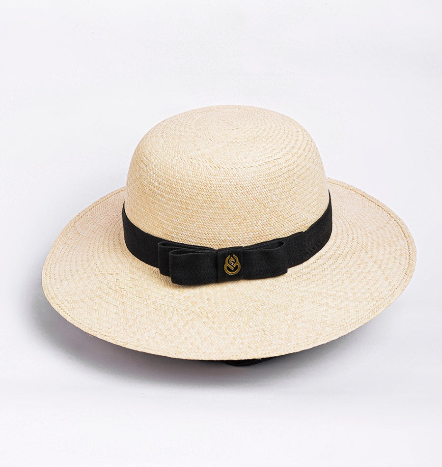 Este sombrero tiene un diseño femenino y sofisticado, con una copa ovalada y ala media, ideal para proteger del sol con estilo. Elaborado en paja toquilla; la decoración consiste e una banda de tela negra adornada con un lazo plano de toque elegante. Ideal para ocasiones al aire libre o días en la playa.